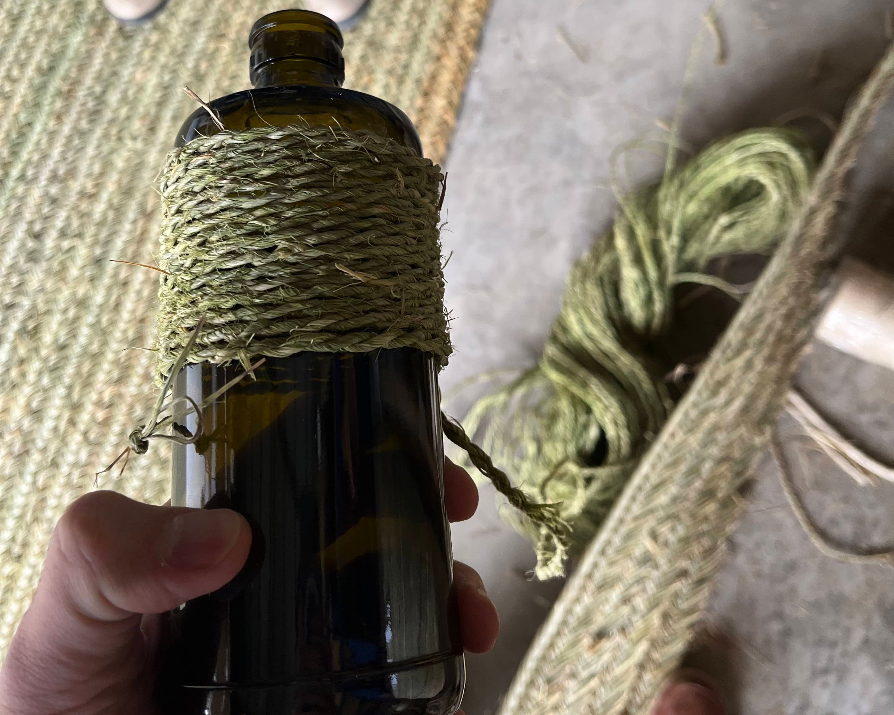 Un artesano de Jaén forra cada botella a mano con esparto natural. Una fibra ibérica milenaria que protege de la temperatura y la luz. Cada botella es una pieza única, como las manos que la crearon.