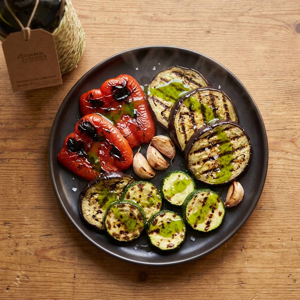 Pimientos, berenjenas, calabacín. Hazlos al carbón o al horno. Y al final, solo al final, unas gotas de este aceite. Lo que ya es saludable se transforma en algo inolvidable.